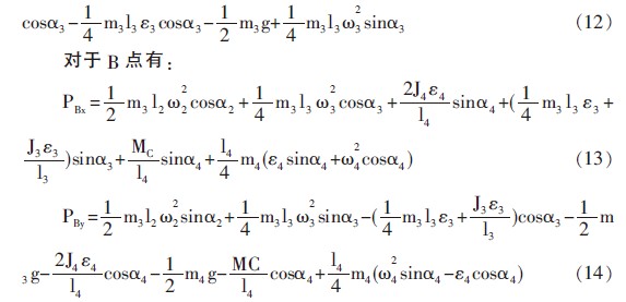 在圖1 所示的機(jī)構(gòu)中,設(shè)主動(dòng)件2 的輸入?yún)?shù)為α2;從動(dòng)件4 的 輸出參數(shù)為α4;各桿長(zhǎng)度為:li(i=1,2,3,4),MO 和MC 分別為輸入力矩和 輸出力矩;mi 和Ji 分別為各桿件的質(zhì)量和繞通過(guò)桿件質(zhì)心軸線的轉(zhuǎn)動(dòng) 慣量;ω2 為常量。 由虛位移原理, 可求得在輸出力矩MC 不變的情況下的輸入力矩 MO,即: