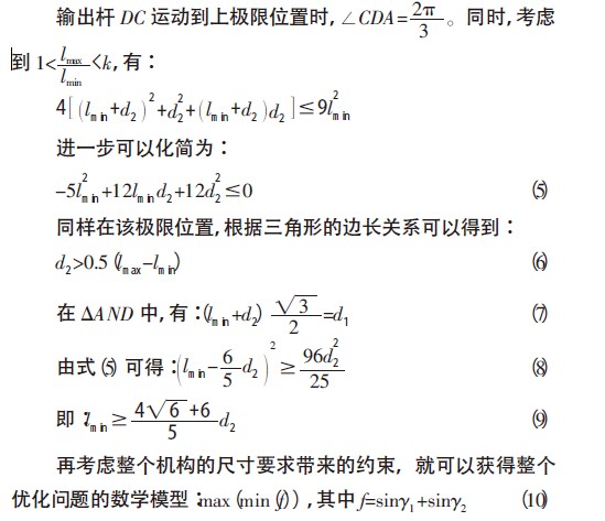 在機(jī)構(gòu)設(shè)計(jì)中,一般通過限定機(jī)構(gòu)的最小傳動(dòng)角來確保機(jī)構(gòu)具有良好的傳力特性,即要求: