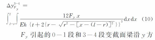 直梁圓角形柔性鉸鏈的模型如圖2所示,將柔性鉸鏈的右端固定,將輸入力和力矩作用在柔性鉸鏈的左端,定義x軸正方向為柔性鉸鏈固定端指向自由端,y軸為垂直于直梁薄片平面方向,坐標系遵循右手定則。圖中0-1段和3-4段為圓角部分,1-3段為直梁部分。柔性鉸鏈為厚度t隨著x變化的變截面梁,其函數表達式為