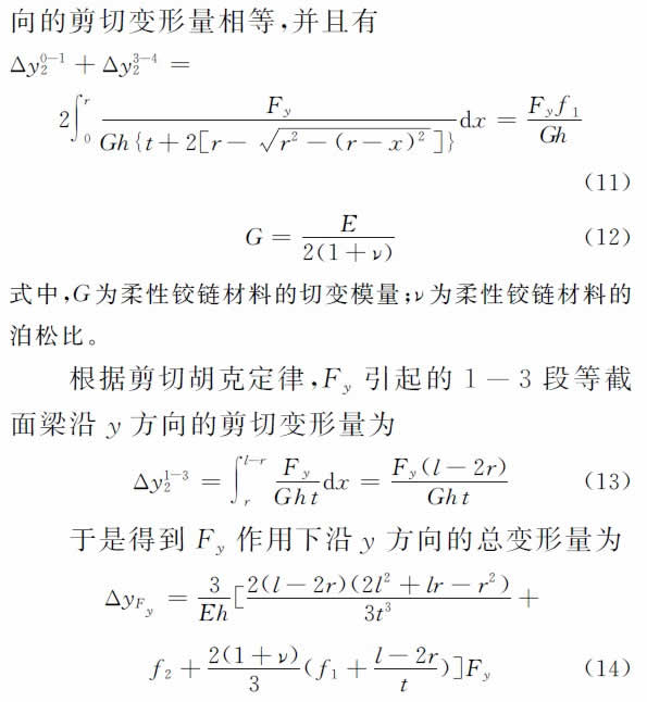 柔性鉸鏈利用其自身的彈性變形而非剛性元件的運動來傳遞或轉換運動、力或能量,相對于傳統(tǒng)運動鉸鏈,柔性鉸鏈具有運動分辨率高、無摩擦、無需潤滑、制造工藝簡單等優(yōu)點,已被廣泛應用于投影光刻物鏡、硅片工作臺、電子掃描顯微鏡、空間光學遙感器[7飊8]等精密器件,以及精密和超精密加工等領域。柔性鉸鏈的柔度是柔性鉸鏈、柔順機構的關鍵參數,直接關系到柔順機構的動態(tài)特性及其末端的定位精度。國內外圍繞柔性鉸鏈的柔度開展了很多研究工作。Paros等推導了單軸和雙軸圓弧形柔性鉸鏈柔度的精確計算公式以及簡化公式。吳鷹飛等給出了圓弧形柔性鉸鏈柔度更為簡潔的計算方法。Smith等給出了橢圓形柔性鉸鏈的柔度矩陣計算方法,并通過有限元和實驗的方法進行了驗證。Lobontiu等[14]基于卡氏第二定理建立了直梁圓角形柔性鉸鏈柔度的理論模型,并將其應用到平面運動放大機構中,但該理論模型沒有考慮剪切力的影響。Hale[15]對直梁圓角形柔性鉸鏈進行了分析,建立了其柔度矩陣的計算模型,但模型僅考慮了柔度矩陣對角線的元素。Xu等通過有限元方法對圓弧形、直梁圓角形和橢圓形柔性鉸鏈的運動精度進行了分析。