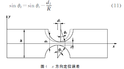 理想鉸鏈的上下切口圓弧是嚴(yán)格對稱的,采用鉆孔或者電火花切割加工時,切口圓弧中心x 方向定位誤差d2如圖4所示,由圖可知