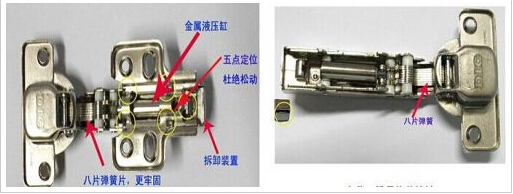 1.外置阻尼器鉸鏈。就是在普通的鉸鏈上外置一個(gè)阻尼器。這種阻尼器一般是氣動(dòng)或者彈簧緩沖的,這是早期落后的阻尼方式。成本低廉,但是使用壽命不高,用個(gè)一兩年就沒有什么阻尼效果了。(道理很簡單,機(jī)械式緩沖的話時(shí)間久了就會(huì)金屬疲勞失去作用)。