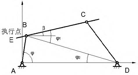 如圖1所示,在曲柄搖桿機(jī)構(gòu)的基礎(chǔ)上,使用一個(gè)步進(jìn)電機(jī)控制連桿BC,實(shí)現(xiàn)連桿長(zhǎng)度的變化。另一個(gè)步進(jìn)電機(jī)控制曲柄轉(zhuǎn)動(dòng)。在機(jī)構(gòu)運(yùn)動(dòng)過程中,通過控制曲柄的轉(zhuǎn)動(dòng)和連桿長(zhǎng)度變化,合成執(zhí)行點(diǎn)E的運(yùn)動(dòng),使連桿上點(diǎn)E走出不同的軌跡。