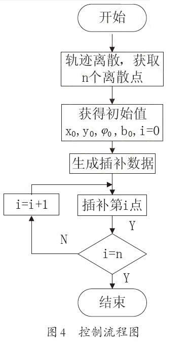 圖4是總體的控制方案流程。用Matlab處理預(yù)定軌跡獲取離散點(diǎn),獲取初始值。計(jì)算出插補(bǔ)過程中連桿所有步長(zhǎng)△bi,依次插補(bǔ)直到終點(diǎn)結(jié)束。