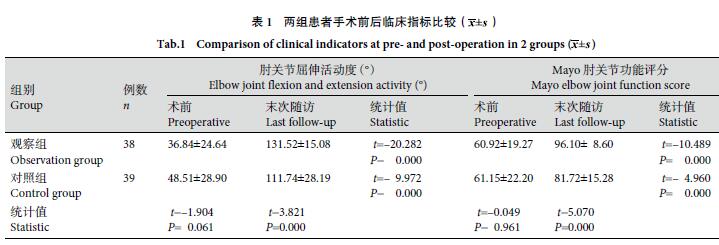 對(duì)照組:男28例,女11例;年齡16~59歲,平均33.7歲。致傷原因:創(chuàng)傷性21例,滑膜炎11例,骨關(guān)節(jié)炎7例。原始損傷診斷類型:肘關(guān)節(jié)損傷三聯(lián)征2例,鷹嘴骨折8例,經(jīng)鷹嘴骨折脫位2例,合并尺骨鷹嘴骨折6例,尺骨骨折2例,合并肱骨鷹嘴骨折3例,肱骨骨折12例,橈骨骨折4例。受傷至手術(shù)時(shí)間5~210個(gè)月,平均30.1個(gè)月。兩組患者性別、年齡、致傷原因、原始損傷診斷類型、受傷至手術(shù)時(shí)間及術(shù)前肘關(guān)節(jié)屈伸活動(dòng)度、Mayo肘關(guān)節(jié)功能評(píng)分等一般資料比較差異均無(wú)統(tǒng)計(jì)學(xué)意義(P>0.05),具有可比性。見表1。