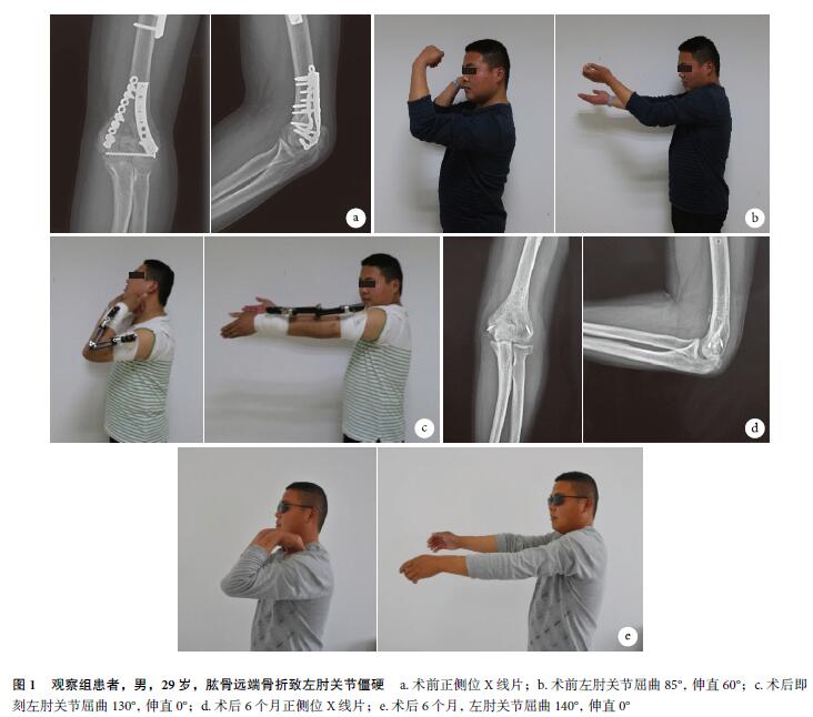 觀察組:男25例,女13例;年齡23~62歲,平均35.9歲。致傷原因:創(chuàng)傷性27例,滑膜炎6例,骨關(guān)節(jié)炎5例。原始損傷診斷類型:肘關(guān)節(jié)損傷三聯(lián)征5例,鷹嘴骨折6例,合并尺骨鷹嘴骨折2例,尺骨骨折5例,合并肱骨鷹嘴骨折3例,肱骨骨折10例,橈骨骨折7例。受傷至手術(shù)時(shí)間6~240個(gè)月,平均27.5個(gè)月。