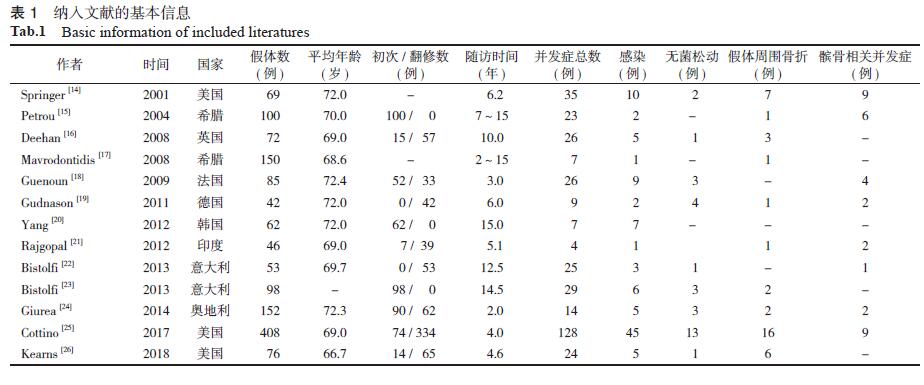 一、文獻檢索結(jié)果共檢索出1906篇文獻,通過題目、摘要及全文閱讀,最終納入13篇旋轉(zhuǎn)鉸鏈式膝關(guān)節(jié)假體置換術(shù)后并發(fā)癥發(fā)生率的文獻[14-26]。均為觀察性研究總樣本例數(shù)為1416例,354例發(fā)生并發(fā)癥。納入文獻的基本情況見表1,2。