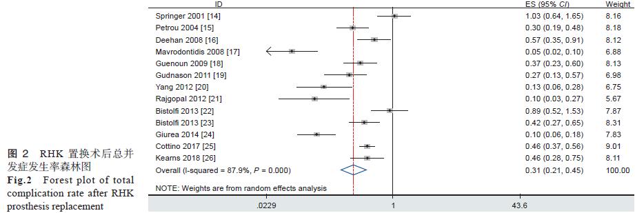 1.總并發(fā)癥發(fā)生率:納入13篇文獻,異質(zhì)性檢驗I2=87.9%,因此采用隨機效應模型。結(jié)果顯示:RHK術(shù)后總并發(fā)癥發(fā)生率為0.31,95%可信區(qū)間估計值(0.21,0.45)(圖2)。經(jīng)公式轉(zhuǎn)化后結(jié)果為23.6%(95%CI:17.4%~31.0%)。