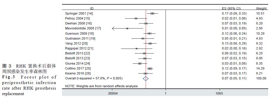2.假體周圍感染發(fā)生率:納入的13篇文獻,研究總樣本例數(shù)為1416例,假體周圍感染101例,經(jīng)異質(zhì)性檢驗I2=57.6%,因此采用隨機效應模型合并13項研究術(shù)后假體周圍感染發(fā)生率為0.07,95%可信區(qū)間(0.05,0.11)(圖3)。公式轉(zhuǎn)化后結(jié)果為6.5%(95%CI:4.8%~9.9%)。