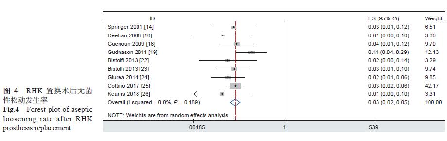 3.假體無菌性松動發(fā)生率:納入的9篇文獻,總例數(shù)1058例,其中假體無菌性松動例數(shù)31例,進行Meta分析。經(jīng)異質(zhì)性檢驗I2=0.0%,因此采用固定效應模型,術(shù)后假體無菌性松動發(fā)生率為0.03,95%可信區(qū)間估計值(0.02,0.05)(圖4)。公式轉(zhuǎn)化后結(jié)果為2.9%(95%CI:2.0%~4.8%)。