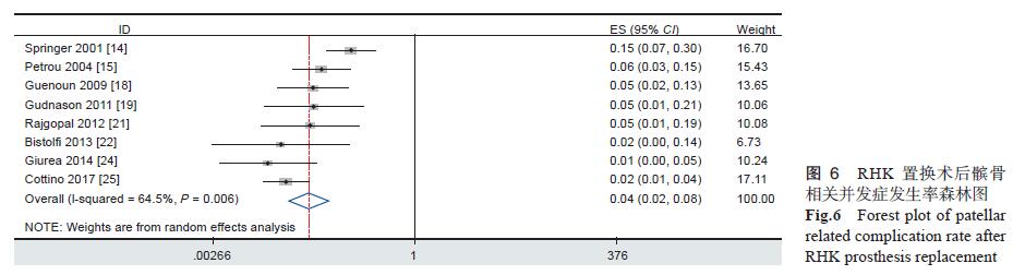 5.髕骨相關(guān)并發(fā)癥發(fā)生率:納入8篇文獻,納入總例數(shù)958例,術(shù)后髕骨相關(guān)并發(fā)癥發(fā)生例數(shù)35例。進行Meta分析,經(jīng)異質(zhì)性檢驗I2=84.5%,因此采用隨機效應模型進行合并。結(jié)果顯示:RHK術(shù)后假體周圍感染發(fā)生率為0.04,95%可信區(qū)間估計值(0.02,0.08)(圖6)。轉(zhuǎn)化后結(jié)果為3.8%(95%CI:2.0%~7.4%)。