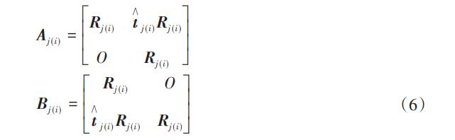 式中:Rj (i)為坐標系{oi}關(guān)于{oj}的方向余弦矩陣,其變量為繞Z坐標軸的旋轉(zhuǎn)角度γj (i);t j (i)為坐標系{oi}關(guān)于{oj}的反對稱移動矩陣,其變量為沿X、Y和Z坐標軸的平動量,即(xj (i),yj(i),zj(i)):