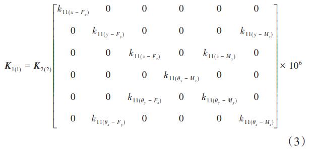 將上述數(shù)值和參數(shù)代入剛度矩陣(1)、(2),并計算可得到各子柔性單元(1、2)關(guān)于其各自局部坐標系的剛度矩陣K1(1)、K2(2)分別為: